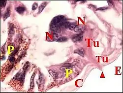 Le corps est formé par un épithélium simple (Fig.4 à 9) reposant sur une basale et non surmonté d’un revêtement cuticulaire. Ses cellules glandulaires ou adénocytes, prismatiques ou pyramidales, renferment des "boules" ou sphérules logées dans des "vacuoles" plus ou moins apparentes, déformant souvent le noyau et captant en général les colorants acides tels que le bleu d’aniline et l'éosine. Teintés également en violacé par l’hématoxyline de Mallory (Fig.7), ces grains de sécrétion réduisent le réactif de Schiff dans la méthode à l’APS (Fig.6,8). Ils passent ensuite dans la lumière et s’y accumulent sous forme d’une masse de sécrétion plus ou moins homogène et à contours festonnés (Fig. 5 à 9).