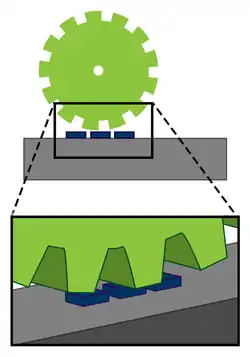 Ce type de capteur utilise un système de codage de position ou d’angle. Le principe est d’avoir un cylindre ou une roue (comme présentée sur le schéma ci-dessous) présentant des pôles magnétiques alternés dont le passage va être détecté par un capteur magnétique. Lors du mouvement, le passage à zéro, qui consiste au renversement de la composante du champ magnétique suivant une direction donnée, permet de localiser la position physique du cran. De ce fait, la résolution de ce capteur dépend de deux paramètres: le nombre de crans (pour une roue crantée) et le nombre de capteurs magnétiques.