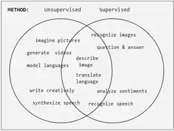 Les tâches du réseau de neurones sont souvent classées comme discriminatives (reconnaissance) ou génératives (imagination). Les tâches discriminatives utilisent souvent (mais pas toujours) des méthodes supervisées et les tâches génératives utilisent des méthodes non supervisées (voir diagramme de Venn) ; cependant, la séparation est très floue.
