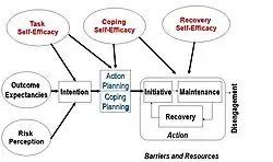 - Auto-efficacité spécifique à la phase : l'auto-efficacité perçue est requise tout au long du processus. Cependant, la nature de l'auto-efficacité diffère d'une phase à l'autre. Cette différence est liée au fait qu'il existe différents défis à mesure que les gens progressent d'une phase à l'autre. La définition des objectifs, la planification, l'initiation, l'action et la maintenance posent des défis qui ne sont pas de même nature. Par conséquent, il convient de faire la distinction entre l'auto-efficacité préventive, l'auto-efficacité d'adaptation et l'auto-efficacité de la récupération[11]. Parfois, les termes de l'auto-efficacité des tâches au lieu de l'auto-efficacité de la préaction, et de l'auto-efficacité de la maintenance au lieu de l'auto-efficacité de l'adaptation et de la récupération sont préférés.