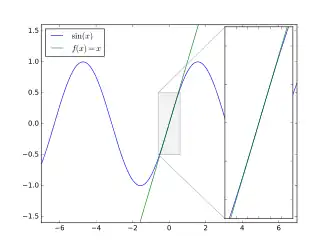 Le développement de Maclaurin (le développement de Taylor autour de 0) de la fonction sinus est[5]où θ est l'angle en radians. De manière plus claire,Le deuxième terme le plus significatif (de troisième ordre) se décompose en cube du premier terme; ainsi, même pour un angle tel que 0,01, la valeur du deuxième terme le plus significatif est de l'ordre de 0,000 001, ou110 000 du premier terme. On peut ainsi approximer sans problème :Alors, puisque le cosinus d'un petit angle est très proche de 1, et que la tangente est donnée par le sinus divisé par le cosinus,