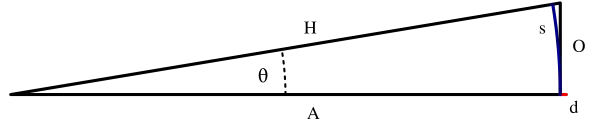 La section rouge à droite, d, est la différence entre les longueurs de l'hypoténuse, H, et le côté adjacent, A . Comme indiqué, H et A ont presque la même longueur, ce qui signifie que cos θ est proche de 1 et θ22 augmente la précision en réduisant la section rouge.La longueur du côté opposé, O, est approximativement égal à la longueur de l'arc bleu, s . D'après la géométrie, s = Aθ, et la trigonométrie, sin θ = OH et tan θ = OA et de la photo, 0 et mène à:Après simplification,