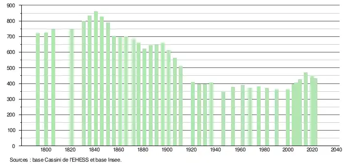 L'évolution du nombre d'habitants est connue à travers les recensements de la population effectués dans la commune depuis 1793. Pour les communes de moins de 10 000 habitants, une enquête de recensement portant sur toute la population est réalisée tous les cinq ans, les populations de référence des années intermédiaires étant quant à elles estimées par interpolation ou extrapolation[19]. Pour la commune, le premier recensement exhaustif entrant dans le cadre du nouveau dispositif a été réalisé en 2004[20].