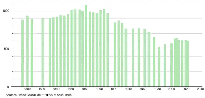 L'évolution du nombre d'habitants est connue à travers les recensements de la population effectués dans la commune depuis 1793. Pour les communes de moins de 10 000 habitants, une enquête de recensement portant sur toute la population est réalisée tous les cinq ans, les populations de référence des années intermédiaires étant quant à elles estimées par interpolation ou extrapolation[24]. Pour la commune, le premier recensement exhaustif entrant dans le cadre du nouveau dispositif a été réalisé en 2004[25].
