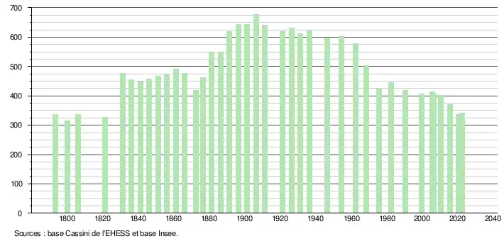 L'évolution du nombre d'habitants est connue à travers les recensements de la population effectués dans la commune depuis 1793. Pour les communes de moins de 10 000 habitants, une enquête de recensement portant sur toute la population est réalisée tous les cinq ans, les populations de référence des années intermédiaires étant quant à elles estimées par interpolation ou extrapolation[27]. Pour la commune, le premier recensement exhaustif entrant dans le cadre du nouveau dispositif a été réalisé en 2005[28].