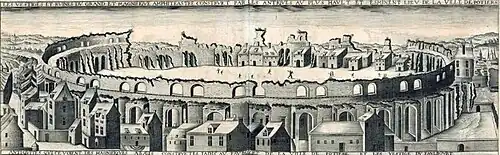 Au Moyen Âge, l'amphithéâtre de Poitiers porte le nom « d'arènes de Poitiers » par synecdoque[N 1] ou, au même titre que ceux de Bordeaux ou de Saintes, de « Palais Gallien »[9]. Au moins dès le XIVe siècle, l'emplacement de l'amphithéâtre, encore imposant, est occupé par diverses habitations et des jardins particuliers[10]. Des écrits du témoignent de la subsistance, à cette époque, de nombreuses arcades et voûtes[11]. En 1757, trois arcades sont mentionnées par les religieux de l'abbaye de Noaillé[12].