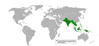 Pour POWO[4], l’espèce est originaire des Philippines et a été introduite aux îles Andaman, Bangladesh, Archipel de Bismarck, Bornéo, Cambodge, Îles Carolines, Chine Centre-Sud, Comores, République dominicaine, Himalaya oriental, Fidji, Hainan, Haïti, Inde, Jamaïque, Java, Laos, Îles-sous-le-Vent britanniques, Petites îles de la Sonde, Malaisie péninsulaire, Maldives, Maluku (Moluques), îles Mariannes, Nouvelle-Guinée, Nicobar, Puerto Rico, Santa Cruz, Îles de la Société, Solomon, Sri Lanka, Sulawesi, Sumatra, Taïwan, Thaïlande, Trinidad-Tobago, Vanuatu, Vietnam.