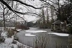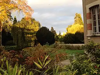 En franchissant la grille d’entrée, le visiteur est au milieu d’une vaste pelouse bordée à gauche par un étang agrémenté en son centre par l’ "Ile Amélie" peuplée de cyprès chauves et de Pterocarya du Caucase donnant des teintes automnales rouille et or. Cette pièce d’eau se rétrécit et se termine par une fabrique, le "lavoir à colonnes".