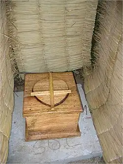 Vue de l'intérieur d'un Arborloo avec une dalle en béton transportable, un siège en bois et des parois en paille.