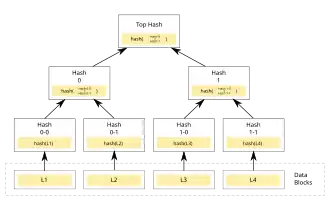 Dans la figure, l'ensemble de données est représenté par les blocs[Quoi ?] L1 à L4. L'arbre est constitué par un ensemble de valeurs de hash[Quoi ?] interdépendantes. Les feuilles de l'arbre sont les valeurs de hash de chacun des blocs de données initiales. Dans un arbre de Merkle binaire, ces hashs sont alors concaténés deux à deux pour pouvoir calculer un nouveau hash parent. Ainsi de suite jusqu'au sommet de l'arbre où on obtient un hash-sommet. Si le nombre de blocs, ou les hashs intermédiaires ne forment pas un arbre binaire, on complète la base avec suffisamment de blocs vides.