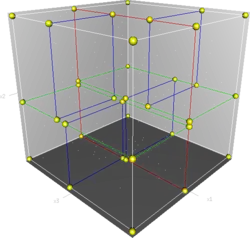 - la direction de l'hyperplan est choisie en fonction de la hauteur du point dans l'arbre ; pour un arbre k-d en dimension 3, le plan de la racine sera par exemple normal au vecteur (1,0,0), le plan des deux enfants sera normal au vecteur (0,1,0), celui des petits-enfants sera normal au vecteur (0,0,1), puis à nouveau normal au vecteur (1,0,0), et ainsi de suite…