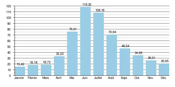 Les crues peuvent être très importantes, voire dévastatrices. En effet, le QIX 2 et le QIX 5 valent respectivement 144 et 188 m3/s. Le QIX 10, le QIX 20 et le QIX 50 n'ont pas été calculés.