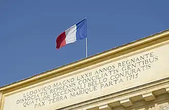 Cet arc de triomphe porte l'inscription suivante : « Ludovico magno LXXII annos regnante dissociatis repressis conciliatis gentibus quatuor decennali bello conjuratis pax terra marique parta 1715 », ce qui se traduit par : « Louis le Grand, dont le règne dura soixante-douze ans, a apporté la paix sur terre et sur mer après avoir séparé, contenu et s'être attaché à des peuples alliés dans une guerre de quarante années ».