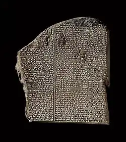 L’épopée d’Atrahasis, écrite en akkadien (la langue de l’ancienne Babylone), raconte comment le dieu Enki enjoint au héros Atrahasis (le « très sage ») de Shuruppak de démanteler sa maison, faite en roseaux, et de construire un bateau afin d’échapper au déluge que le dieu Enlil, irrité par le bruit des villes, entend lancer pour éradiquer l’humanité. Le bateau est censé disposer d’un toit « pareil à celui d’Apsû »[26] (l’océan souterrain d’eau douce dont Enki est le seigneur), de ponts inférieur et supérieur, et doit être rendu étanche par du bitume. Atrahasis monte à bord avec sa famille et ses animaux, puis en scelle l’entrée. La tempête et le déluge commencent, « les cadavres encombrent la rivière comme des libellules », et même les dieux prennent peur. Au bout de sept jours, le déluge cesse et Atrahasis procède à des sacrifices. Enlil, pour sa part, est furieux, mais Enki le défie ouvertement, en déclarant s’être « assuré que la vie soit préservée ». Les deux divinités s’accordent finalement sur d’autres mesures pour réguler la population humaine. L’histoire existe également dans une version assyrienne plus tardive.
