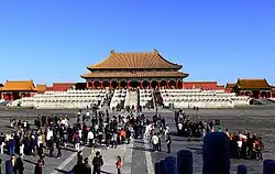 La Cité Interdite couvre une surface de 720 000 m2 et contient 9999,5 chambres. Il fallut 300 000 travailleurs et quatorze années pour compléter ce gigantesque/massif projet de construction. La Cité Interdite représente les distinctions confucéennes entre le souverain/chef et le fonctionnaire/employé, l’homme et la femme, les épouses principales/officielles et les concubines. L’endroit où l’empereur traitait les affaires officielles était localisé à l’avant du complexe de la Cité Interdite. Les importantes cérémonies et le public constitué de militaires et de civils étaient reçus dans trois grands halls construits sur une terrasse élevée du sud au nord le long de l’axe central de la Cité Interdite. La somptuosité de leur construction, de même que leur situation centrale, était l’expression du respect au pouvoir impérial.