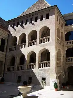 La tour carrée dans la cour de l'hôtel de ville de Genève (1555) par Pernet Desfosses est un bâtiment typique de tradition française en pierre de taille. Elle contient la rampe d'accès qui mène à la salle du Conseil des Deux-Cents.