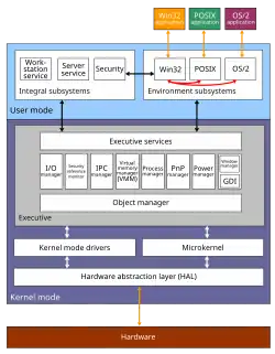 L'Exécutif NT s'interface avec tous les sous-systèmes du mode utilisateur. Il prend en charge les I/O, la gestion des objets, la sécurité et la gestion des processus. Le noyau hybride s'insère entre la couche d'abstraction matérielle(hal.dll) et l'Exécutif pour assurer la synchronisation multi-processeur, l'ordonnancement des threads et des interruptions et la gestion et la répartition des trappes et exceptions.