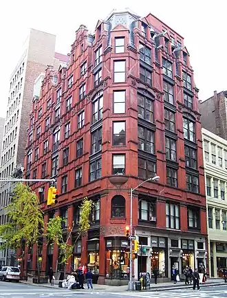 Le style Queen Anne élaboré en Grande-Bretagne par Richard Norman Shaw et d'autres architectes est arrivé à New York avec les nouveaux logements de la New York House and School of Industry [3] ( Sidney V. Stratton , architecte, 1878), 120 West 16th Street. À pignons et d'échelle locale, ces anciennes maisons de la Queen Anne américaine ont été construites en briques vives et douces entourées de panneaux carrés en terre cuite , avec un passage latéral cintré menant à une cour intérieure et à une maison arrière. Leurs détails se limitent en grande partie au traitement des fenêtres disposées de manière pittoresque, avec des vantaux supérieurs à petites vitres et des vitres inférieures en verre plat. Les triples fenêtres à motif serlien et une fenêtre d'oriel à deux étages qui fait saillie de manière asymétrique ont souvent été mise en œuvre[4]. Les Astral Apartments construits à Brooklyn en 1885–1886 pour loger les dockers offrent un exemple similaire de l'architecture Queen Anne en brique rouge et en terre cuite de New York.