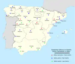 La diffusion de l'architecture gothique en Espagne eut trois influences principales. La première fut l'architecture cistercienne, qui s'étendit sur tout le pays et qui avant le XIIIe siècle avait construit de grands couvent de l'ordre réformé, annonçant l'art gothique[1]. La seconde voie furent les relations maintenues entre le comté de Barcelone avec le languedoc et la Provence ; ainsi que les contacts entre les évêchés catalans et ceux de Narbonne et de Montpellier. La troisième voie se produisit en Castille et Leon, où les mariages des plusieurs rois avec des princesses des maisons d'Anjou, de Bourgogne et de Plantagenet facilitèrent l'introduction du gothique français dans la zone centrale.