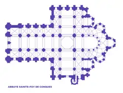 Au IXe siècle le modeste et presque inaccessible monastère de Conques dans le Rouergue vivote mais à la fin du siècle ses moines organisent le rapt des reliques de Sainte-Foy à Agen. Après un siècle sans miracles, ceux-ci se multiplient et Bernard d'Angers écrit Le livre des miracles de Sainte-Foy qui assure sa notoriété. Devant l'affluence des pèlerins, une nouvelle abbatiale est construite vers 1030-1050. Son plan qui a servi de prototype aux églises de pèlerinages est conçu dès le départ dans son ensemble. Il a une nef à trois vaisseaux, un transept très saillant et un chevet à déambulatoire avec trois chapelles rayonnantes associées aux chapelles échelonnées des croisillons du transept. Des tribunes destinées à reprendre les poussées horizontales de la nef sont elles aussi prévues et seront construites un peu plus tard mais l'escalier d'accès est construit dans la même campagne de travaux que le transept. Elles apportent une lumière indirecte au vaisseau central.