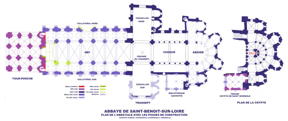 Après les chevets, les architectes s'intéressent aux façades occidentales des églises. À l'abbaye de Saint-Benoît-sur-Loire, l'abbé Gauzlin demi-frère du roi Robert II le Pieux édifie une tour-porche capable de servir de modèle à toute la Gaule. De facture traditionnelle mais ambitieuse, cette tour-porche est construite sur un plan presque carré avec des côtés d'environ 16 mètres pour une surface de 260 m2 sur deux étages. Le rez-de-chaussée a une hauteur de 6,60 mètres et l'étage de 10,35 mètres.