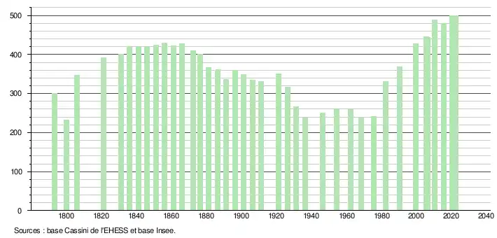 L'évolution du nombre d'habitants est connue à travers les recensements de la population effectués dans la commune depuis 1793. Pour les communes de moins de 10 000 habitants, une enquête de recensement portant sur toute la population est réalisée tous les cinq ans, les populations de référence des années intermédiaires étant quant à elles estimées par interpolation ou extrapolation[17]. Pour la commune, le premier recensement exhaustif entrant dans le cadre du nouveau dispositif a été réalisé en 2005[18].