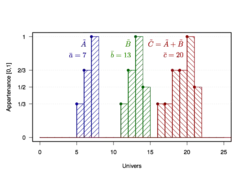 Intuitivement, ajouter, soustraire, multiplier ou diviser deux nombres flous nécessite de calculer la fonction d'appartenance associée au résultat (un autre nombre flou). À titre d'exemple, on s'intéresse ici à l'expression arithmétique où et sont deux nombres flous, dont les fonctions d'appartenances sont illustrées sur la figure 4 ci-contre. Leurs fonctions d'appartenance sont respectivement définies par :