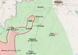 Le 28 mai, l'Armée de la conquête attaque Ariha, mais les forces de l'armée syrienne et du Hezbollah battent rapidement en retraite et après seulement trois heures de combats, la ville est prise à son tour[15],[16],[17]. Selon l'OSDH, 18 soldats et miliciens loyalistes sont tués au combat et 13 autres sont capturés et exécutés[18]. Les rebelles tiennent alors la quasi-totalité du gouvernorat d'Idleb[15].