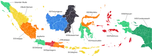 - Une structure de commandement territoriaux, les Komando Daerah Militer ("commandements de région militaire") ou « Kodam », au nombre de 15, couvrant chacun une ou plusieurs provinces,