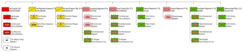 - Compagnie d'état-major et de soutien, deux compagnies de chars Stridsvagn 122, deux compagnies mécanisées CV90, compagnie de logistique