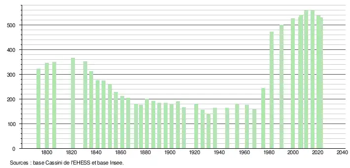 L'évolution du nombre d'habitants est connue à travers les recensements de la population effectués dans la commune depuis 1793. Pour les communes de moins de 10 000 habitants, une enquête de recensement portant sur toute la population est réalisée tous les cinq ans, les populations de référence des années intermédiaires étant quant à elles estimées par interpolation ou extrapolation[31]. Pour la commune, le premier recensement exhaustif entrant dans le cadre du nouveau dispositif a été réalisé en 2005[32].