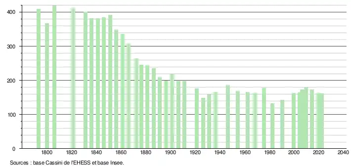 L'évolution du nombre d'habitants est connue à travers les recensements de la population effectués dans la commune depuis 1793. Pour les communes de moins de 10 000 habitants, une enquête de recensement portant sur toute la population est réalisée tous les cinq ans, les populations de référence des années intermédiaires étant quant à elles estimées par interpolation ou extrapolation[21]. Pour la commune, le premier recensement exhaustif entrant dans le cadre du nouveau dispositif a été réalisé en 2004[22].