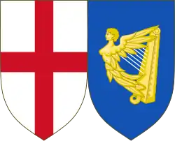 Écartelé: au 1 et 4, de gueules, à trois léopards d'or (qui est Angleterre), au 2, d'or, au lion de gueules, au double trescheur fleuronné et contre-fleuronné du même (qui est Écosse), au 3, d'azur, à la harpe d'or, cordée d'argent (qui est Irlande)