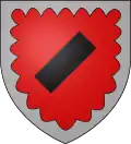 de gueules à la bordure engrélée d'argent et au bâton de sable péri en barre[1].