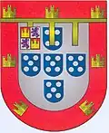 Rois de Portugal (1247-1383) - dynastie de Bourgogne d'argent aux cinq écus d'azur disposés en croix, chaque écu chargé de cinq besants d'argent disposés en sautoir, à la bordure de gueules chargée de onze châteaux d'or, donjonnés de trois tours, ouverts et ajourés d'azur |