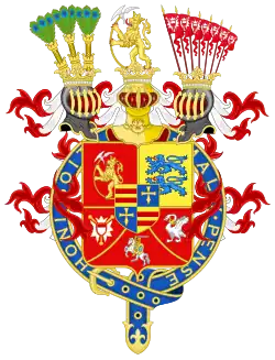 Ecartelé : aux I et IV contre-écartelé d'azur à trois fleurs-de-lys-d'azur, et de gueules aux trois léopards d'or ; au II d'or, au lion de gueules, au double trescheur fleuronné et contre-fleuronné du même ; d'azur, à la harpe d'or, cordée d'argent ; sur le tout d'or, à neuf cœurs de gueules, posés en trois pals, à trois lions léopardés d'azur, armés et lampassés de gueules, couronnés du champ, brochant sur-le-tout (de Danemark) ; un label d'argent brochant sur la partition, le deuxième lambel chargé d'une Croix de saint Georges de gueules |