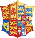 Ecartelé, en I et IV de gueules aux trois léopards d'or, en II d'or, au lion de gueules, au double trescheur fleuronné et contre-fleuronné du même et en III d'azur, à la harpe d'or, cordée d'argent, un lambel d'argent brochant sur la partition ; sur le tout, écartelé d'or et de gueules, à quatre lions de l'un à l'autre armés et lampassés d'azur, et surmonté de la couronne de Prince de Galles |