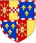 Coupé en 1, parti en 1 de gueules, à l'écusson d'argent, aux rais d'escarboucle d'or, brochantes sur le tout, et en 2 d'or, à la fasce échiquetée d'argent et de gueules de trois tires et en 2 d'azur semé de fleurs de lys d'or à la bordure componée d'argent et de gueules[source insuffisante],[8]. |