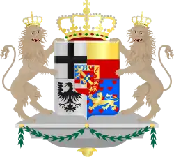 Écartelé d'azur semé de billettes d'or au lion couronné du second armé et lampassé de gueules brochant (maison de Nassau) et burelé de dix pièces d'argent et d'azur au lion de gueules à la queue fourchée et passée en sautoir, armé, lampassé et couronné d'or brochant (Luxembourg)