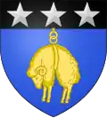 D'azur à la bande cousue de gueules chargée de trois besants d'or et accompagnée de deux hures de sanglier de sable, celle du chef contournée.