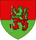 De gueules à la tour ruinée d'argent, maçonnée de sable, ouverte et ajourée du champ, au chef cousu d'azur chargé d'un lion issant d'or.