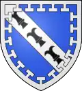 De gueules au lion d'argent et une bande d'azur brochante ; au chef de gueules soutenu d'azur et chargé de trois coquilles d'argent.[15],[16]