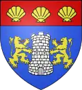 D'azur, à la tour d'argent maçonnée de sable soutenue de deux lions d'or, armés et lampassés de gueules ; au chef cousu de gueules, chargé de trois coquilles d'or |