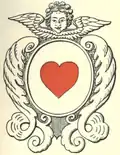de gueules à deux épées d'or (parfois des pistolets d'arçon) mises en sautoir, accompagnées de trois étoiles du même, une en chef, deux aux flancs et d'un cœur d'argent en pointe.[3] |
