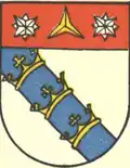 de gueules à la bande d'or chargée d'une bande d'azur (ou de sinople) surchargée de trois étoiles d'or et accompagnée de deux trèfles tigés du même.[2] |