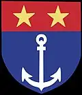 d'azur à l'ancre d'argent au chef cousu de gueules, chargé de deux étoiles d'or.[9] |