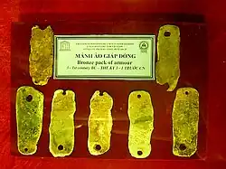 - l'écaille : petites écailles souvent de métal, parfois de bois ou d'os, très efficace contre les coups de taille (avec le tranchant de la lame), mais vulnérable aux coups d'estoc (avec la pointe de la lame)