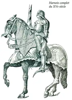 Les chevaux pouvaient également avoir une armure afin de les protéger des coups de lance et d'épée. L’équivalent équin du harnois plain se nommait caparaçon (et non carapaçon, qui est une fausse étymologie). La protection de tête du cheval se nommait chanfrein.