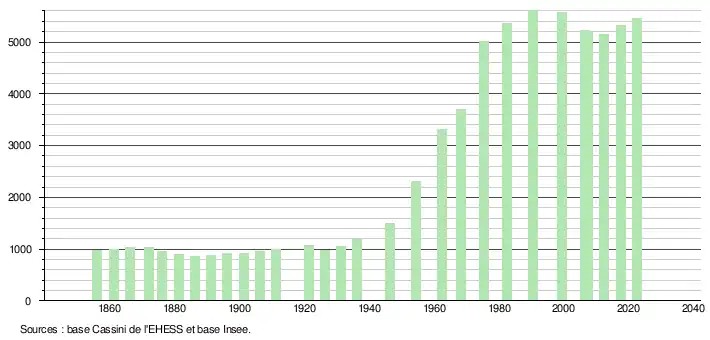 L'évolution du nombre d'habitants est connue à travers les recensements de la population effectués dans la commune depuis 1856. Pour les communes de moins de 10 000 habitants, une enquête de recensement portant sur toute la population est réalisée tous les cinq ans, les populations de référence des années intermédiaires étant quant à elles estimées par interpolation ou extrapolation[18]. Pour la commune, le premier recensement exhaustif entrant dans le cadre du nouveau dispositif a été réalisé en 2007[19].