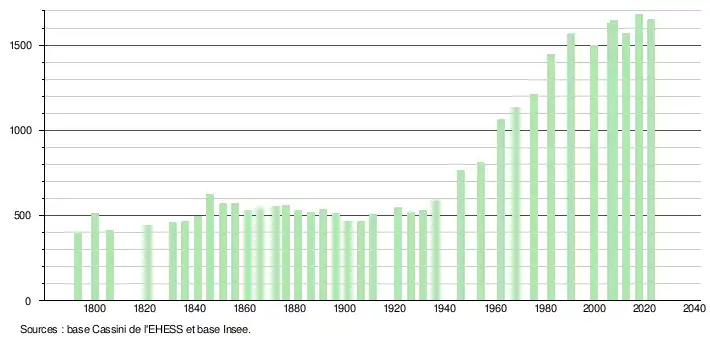 L'évolution du nombre d'habitants est connue à travers les recensements de la population effectués dans la commune depuis 1793. Pour les communes de moins de 10 000 habitants, une enquête de recensement portant sur toute la population est réalisée tous les cinq ans, les populations de référence des années intermédiaires étant quant à elles estimées par interpolation ou extrapolation[22]. Pour la commune, le premier recensement exhaustif entrant dans le cadre du nouveau dispositif a été réalisé en 2007[23].